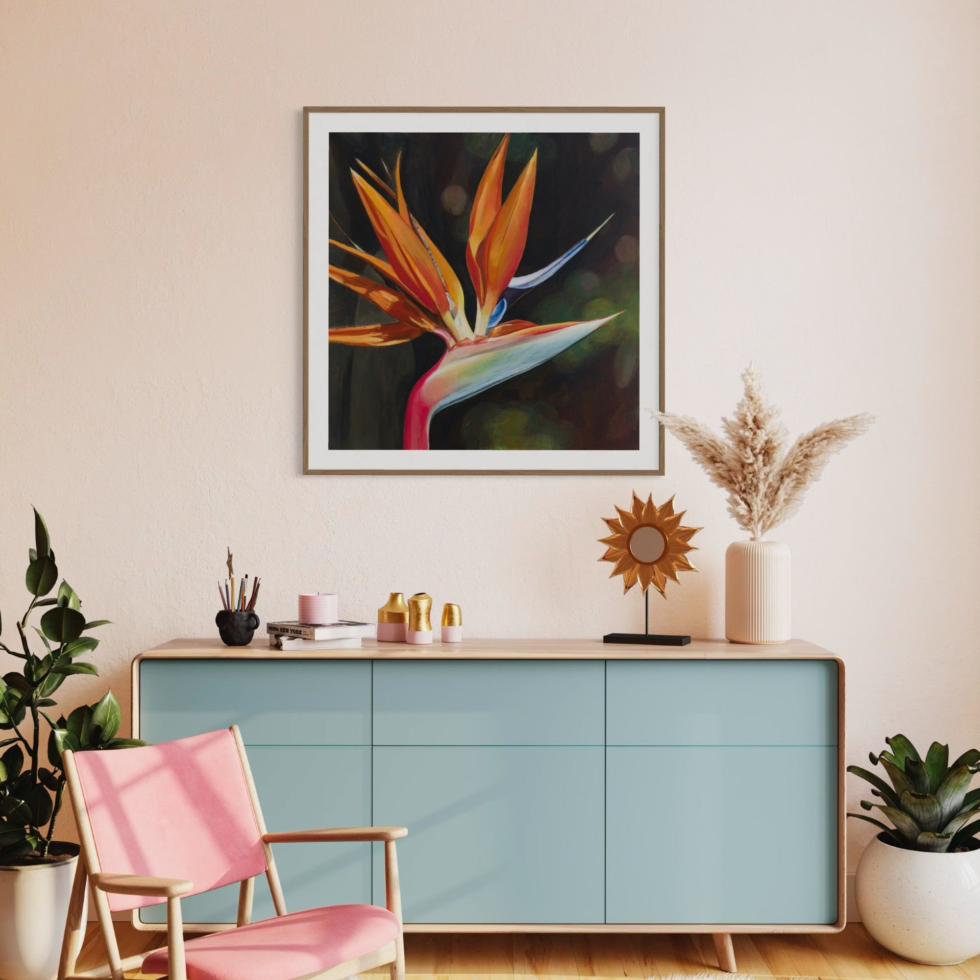 This tropical artwork captures their striking orange and blue forms, bringing warmth, colour, and elegance into your home.