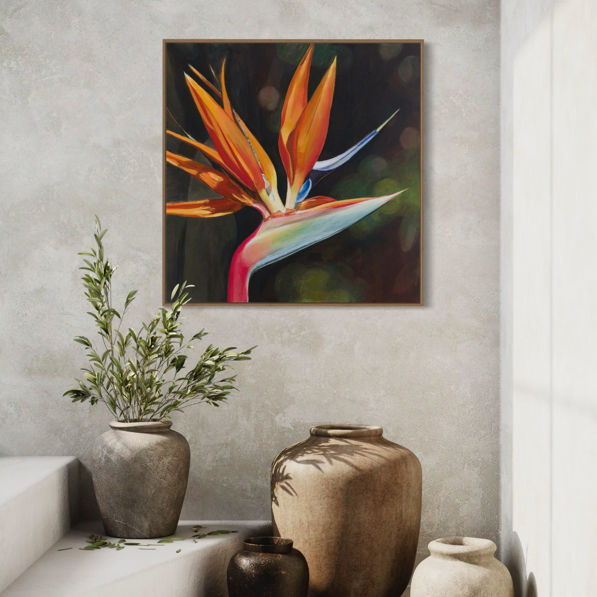 Make a bold statement with Bird in Bloom, a fine art canvas print capturing the vivid beauty and dramatic form of the Bird of Paradise flower. Painted in Cornwall and inspired by the tropical displays at Tresco Abbey Gardens, this artwork highlights a single bloom set against a rich backdrop. Choose from unframed or framed, ready for hanging, in a range of sizes to suit your space.