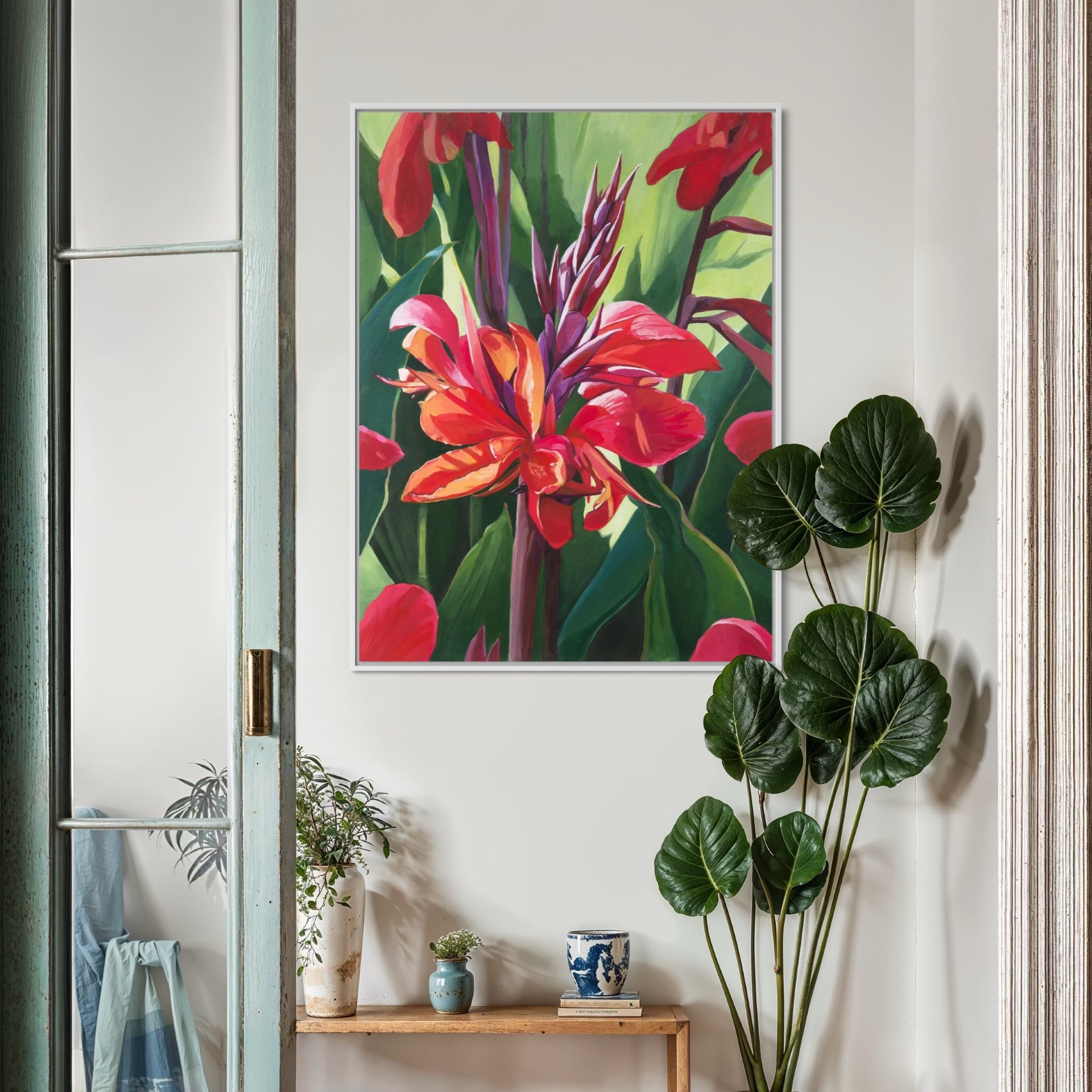 Make a vibrant statement with Canna in Bloom, a fine art canvas print inspired by the bold sculptural flowers of the Canna lily, celebrated for their tropical drama and radiant colour. This fine art canvas print is created from an original painting and is available unframed or with a slim float frame. It is ready to bring warmth and colour to your space.