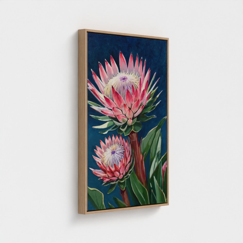 Make a refined statement with Protea in Pink, a fine art canvas print celebrating the sculptural beauty of protea blooms in soft pink tones. Created from an original painting, this canvas print is available unframed or with a slim float frame and is ready to bring warmth, texture, and understated colour to your space.